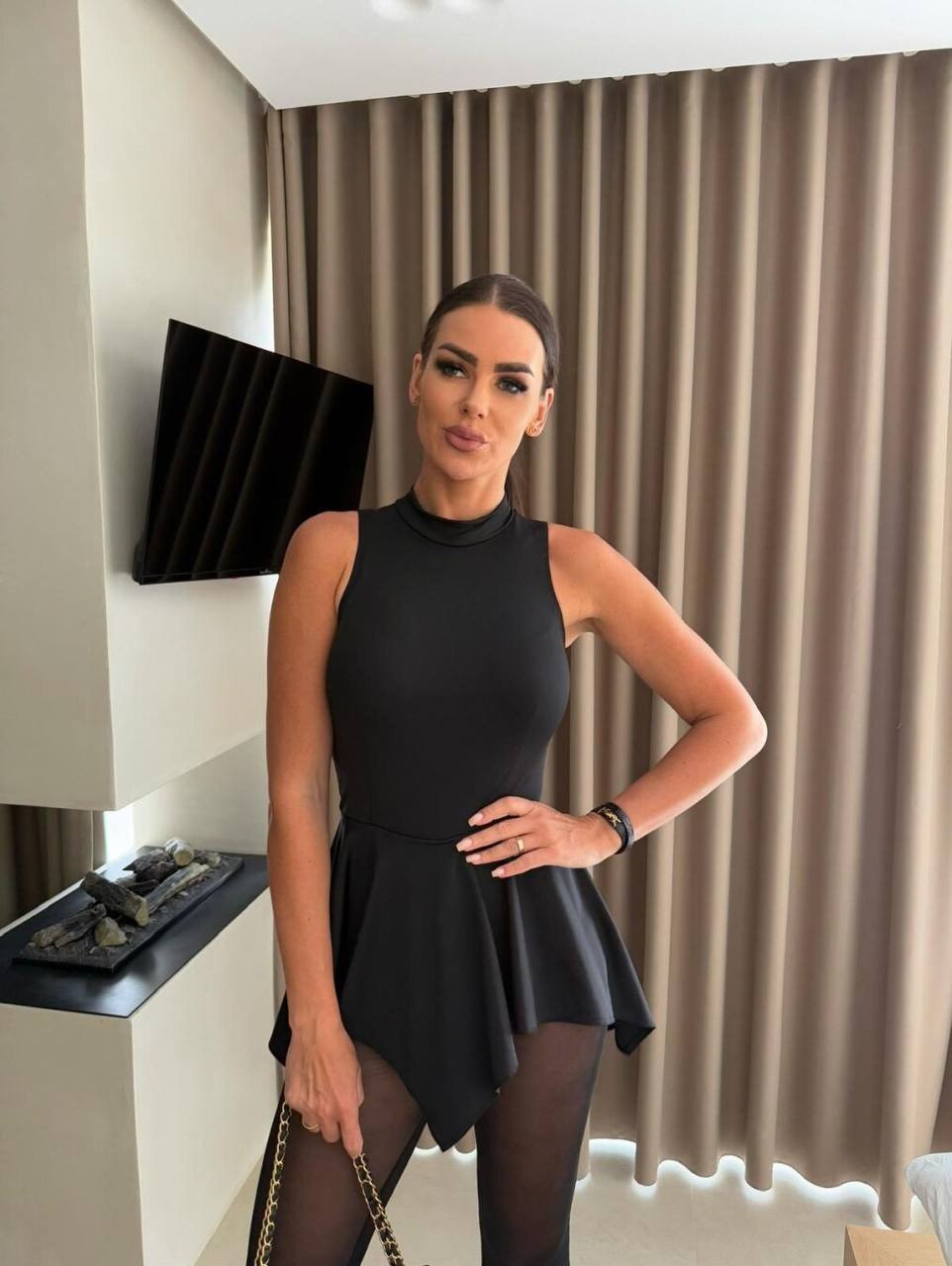A chic sleeveless jumpsuit featuring a high neckline, asymmetrical peplum-style overlay, and sheer wide-leg pants. The combination of structured top and flowy transparent legs creates a sophisticated yet daring look, perfect for evening events, upscale dinners, or fashion-forward parties.