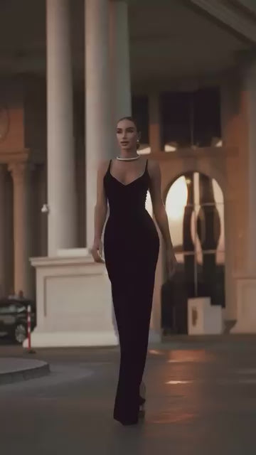 Indulge in unparalleled glamour with the Obsidian Slip Gown. Crafted from sumptuously soft black velvet, this dress embodies timeless luxury and dark romance.