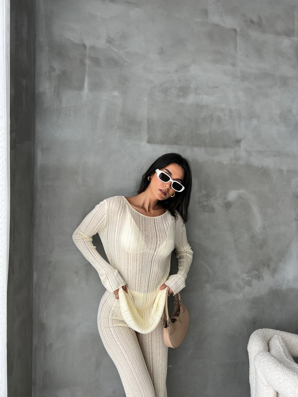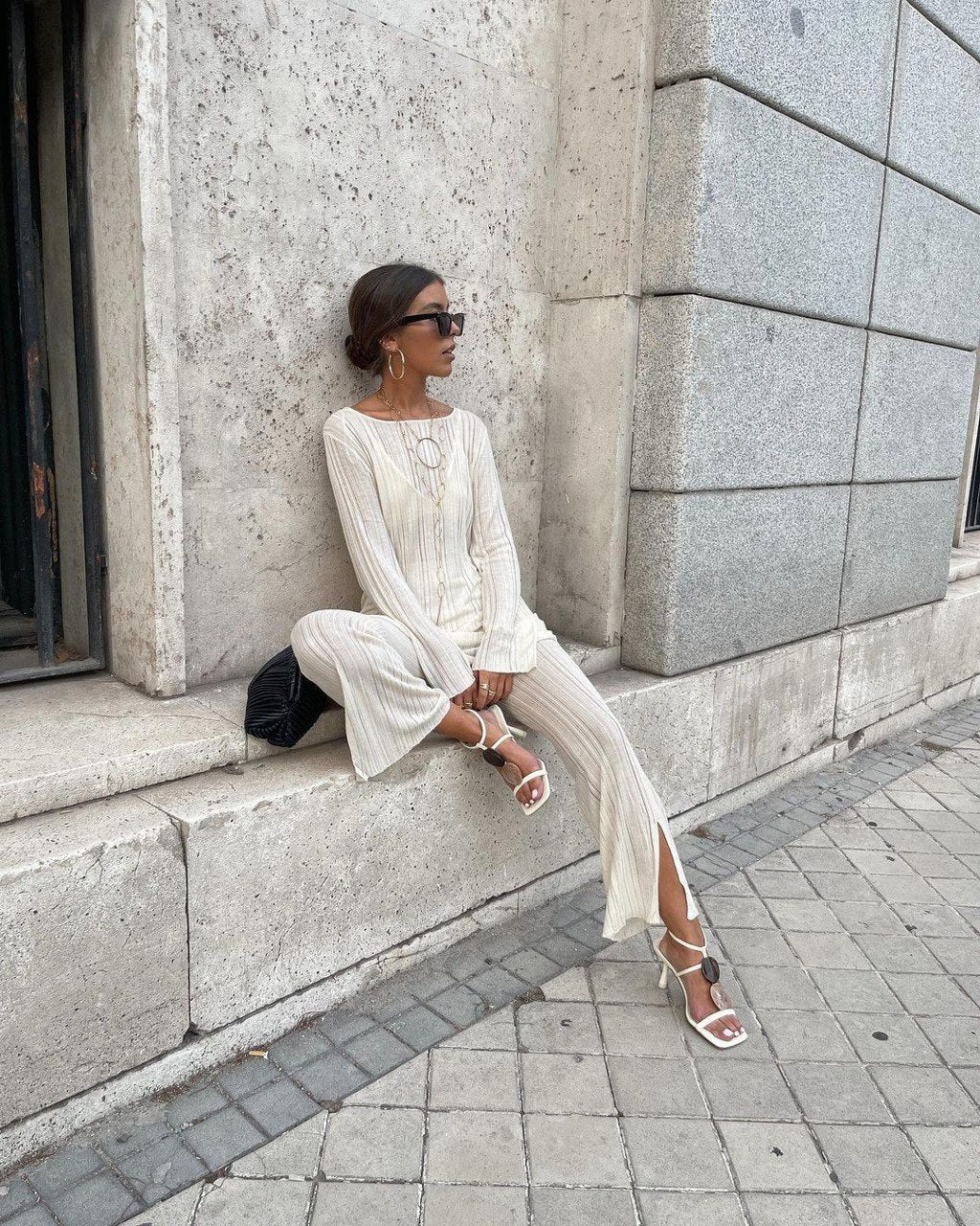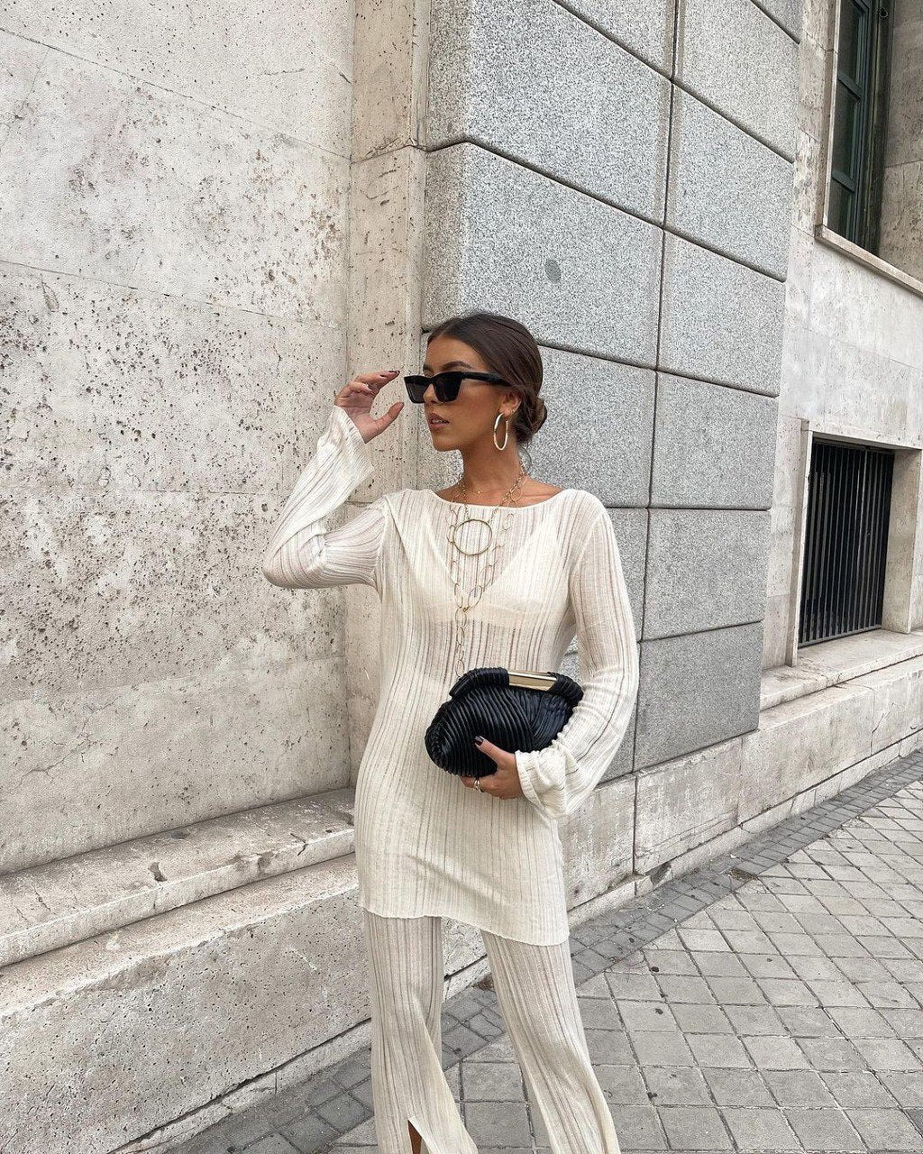 A chic two-piece set featuring a long-sleeve ribbed tunic top paired with matching high-waist fitted pants with front slits. The minimalist design and textured fabric create a refined and modern silhouette, perfect for elegant casual outings, resort wear, or upscale city looks.