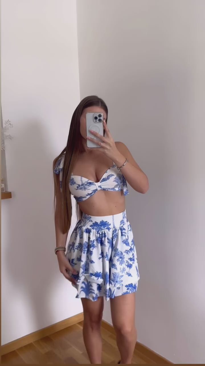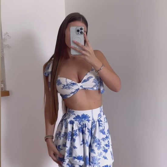 A charming two-piece set featuring a tie-shoulder crop top with a flattering neckline, paired with a matching flared mini skirt. Adorned with delicate blue tropical prints on a light base, this set is perfect for summer getaways, beachside lunches, or resort strolls.