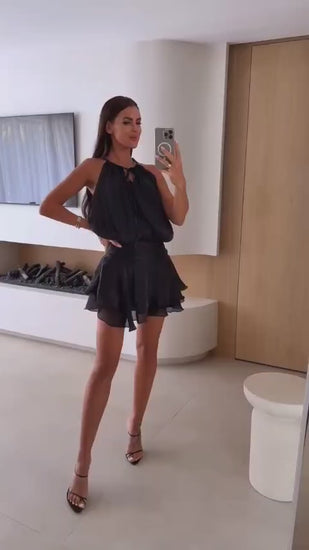 Designed in sleek black, this dress features a halter neckline with a soft tie detail and a flattering cinched waist that flows into a playful layered hem.
