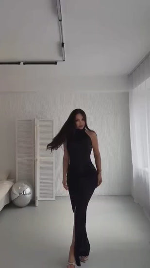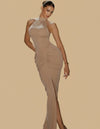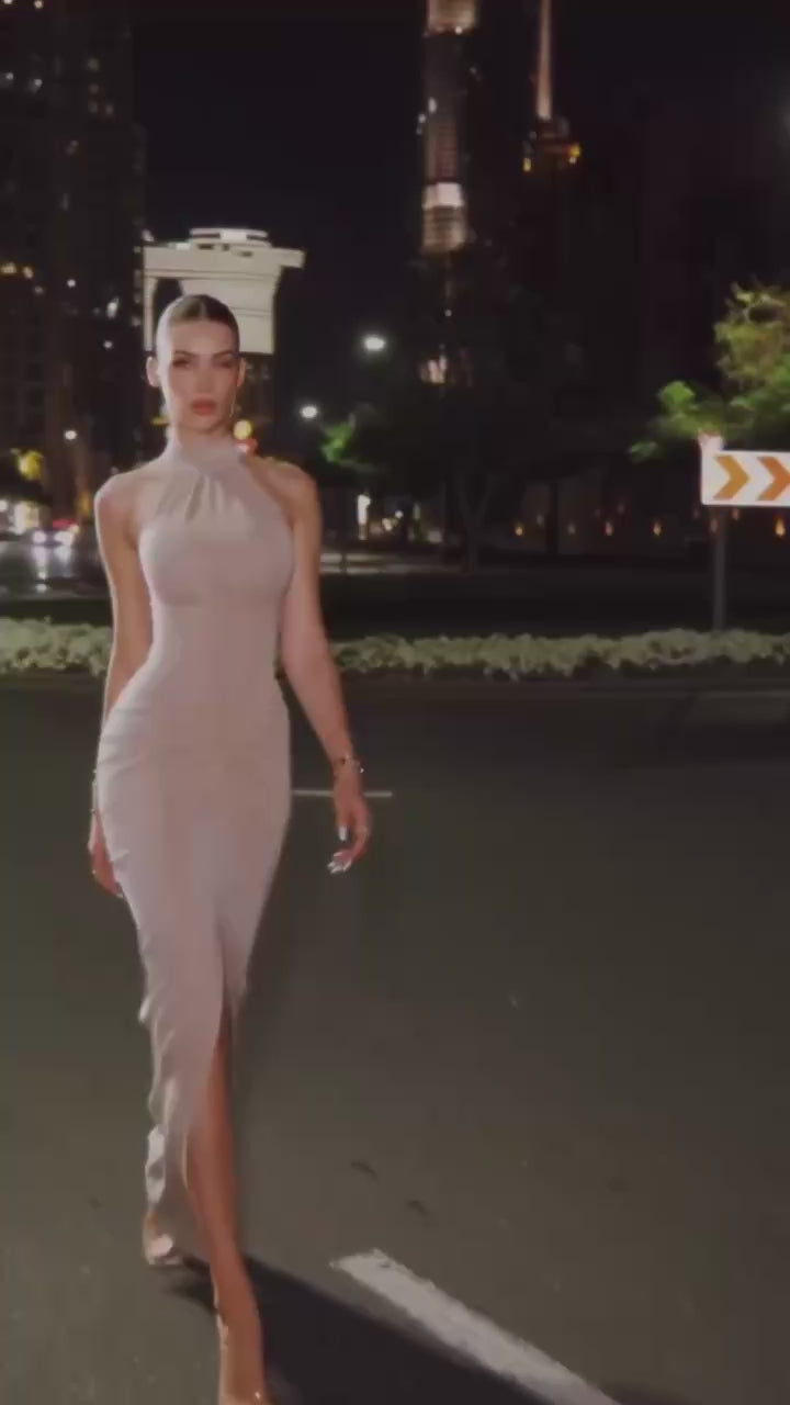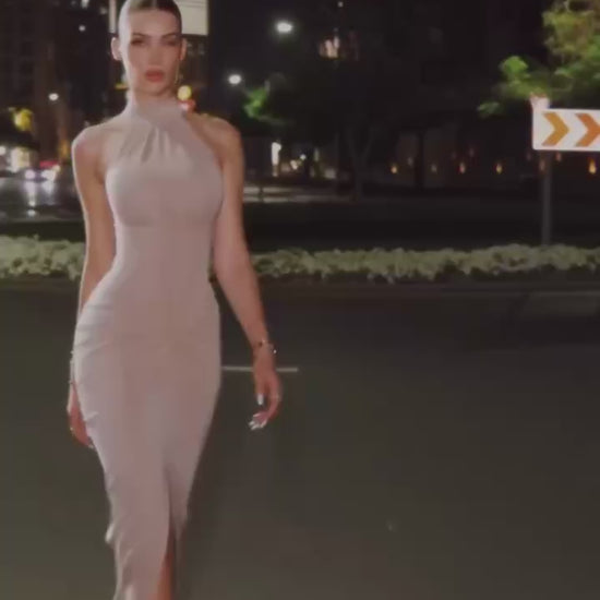 Turn heads in the 'Desert Muse' Ruched Halter Maxi Dress. In a sophisticated, curve-enhancing nude/tan hue, this dress features a chic high halter neckline and strategic side ruching that sculpts and flatters your figure. The daring side slit adds a touch of sultry movement. It's the ultimate blend of minimalist design and high-fashion drama, perfect for sunset dinners or upscale events.