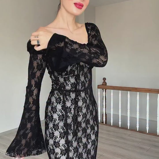 Indulge in timeless allure with the 'Noir Romance' Maxi Gown. This breathtaking dress features delicate black lace overlaying a nude lining, creating a captivating visual depth. The elegant sweetheart neckline, figure-hugging silhouette, and dramatic bell sleeves combine for a truly unforgettable look. Perfect for galas, formal events, or any occasion where you want to exude refined glamour.