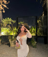 This figure-hugging mini dress is designed to command attention with its striking features. The soft, neutral sandstone hue is perfectly complemented by long, sheer mesh sleeves that fall over the hands. The bodice is highly structured, featuring a deep plunge neckline and daring midriff cutouts accentuated by chic metallic O-ring hardware.