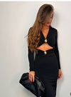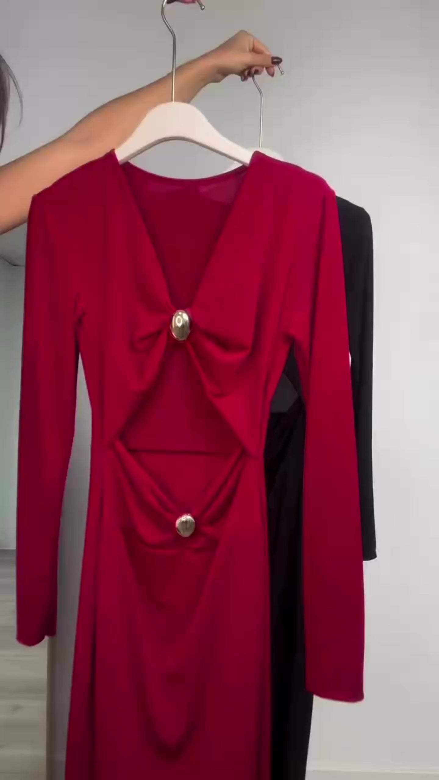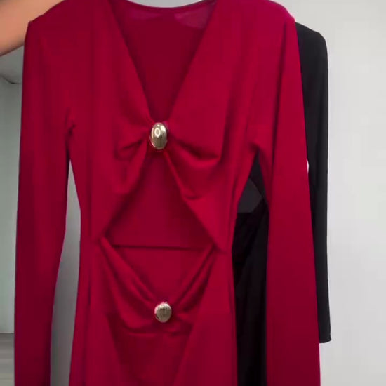This stunning black (or ruby) dress commands attention with its impeccably tailored silhouette. It features a deep plunge V-neckline and long, sleek sleeves, balancing coverage with alluring reveal. The defining detail is the bold midriff cutout, which is expertly framed and cinched by two prominent gold statement brooches.