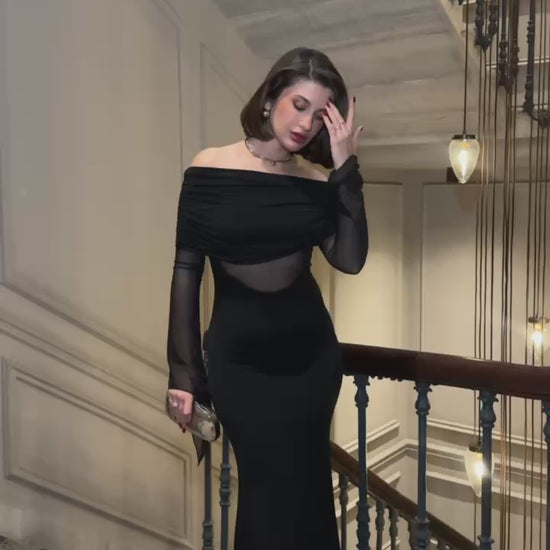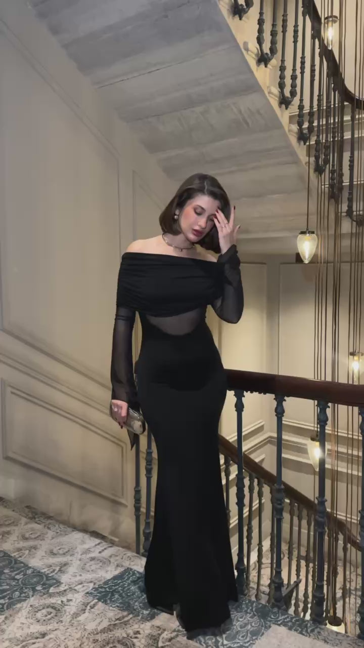 The look is completed by elegant sheer mesh sleeves that flare gently at the wrist and a form-fitting maxi skirt that pools beautifully at the floor. Crafted in sleek black fabric, the Spectre Maxi is the ultimate choice for galas, black-tie events, or any grand occasion where you want to embody refined mystery.