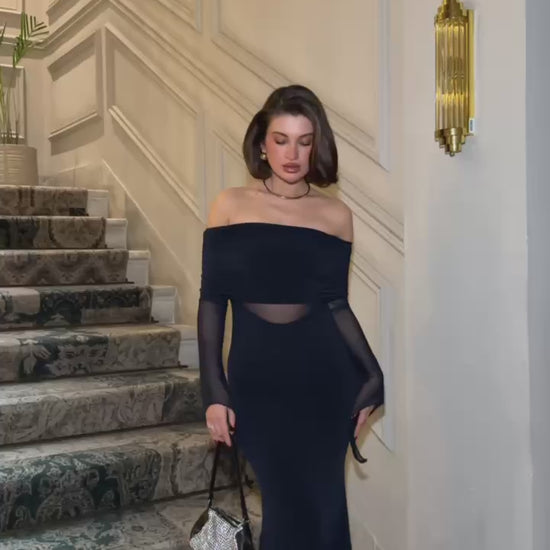 Make a dramatic, unforgettable entrance in the Spectre Maxi Dress. This gown is designed with high-contrast allure, blending classic elegance with a sensual, illusory reveal.