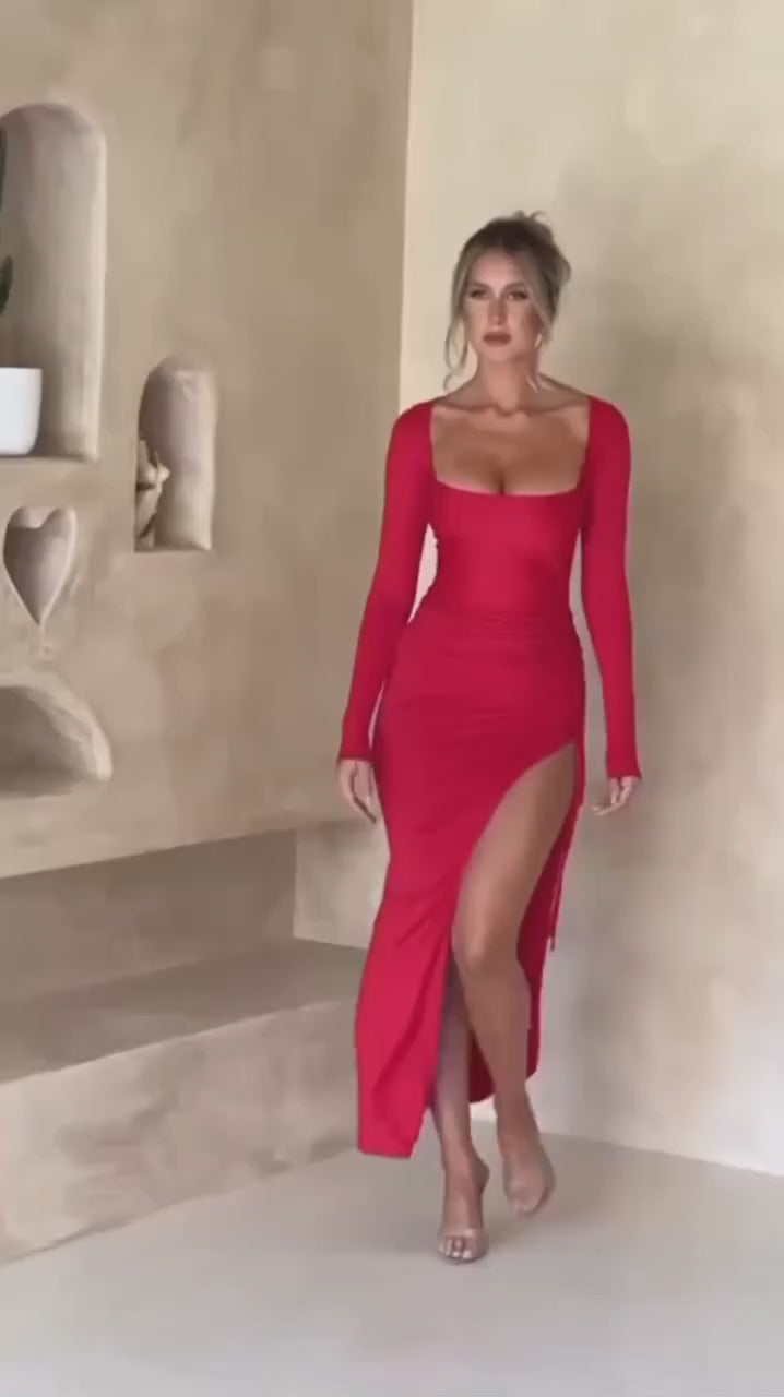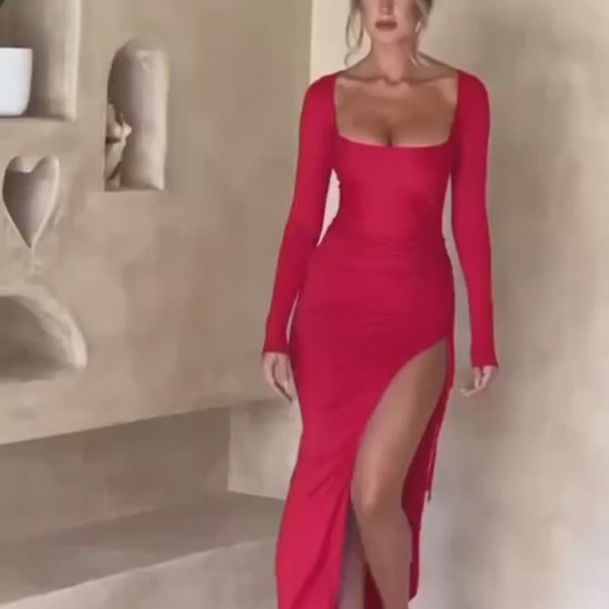 This sophisticated midi dress commands attention with its rich vermillion hue and elegant square neckline. The bodice features sleek long sleeves and a body-contouring fit, crafted from a premium stretch fabric that hugs and smooths your figure.