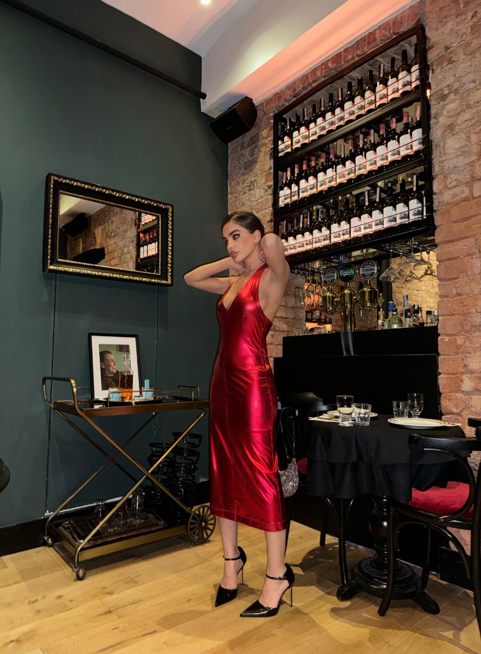 The fabric is tailored to a form-fitting, bodycon midi silhouette that emphasizes your curves down to the knee-length hem. It requires minimal accessorizing—the Molten Gold Dress is a complete, unforgettable statement. It's the ultimate choice for cocktail parties, upscale bar nights, or any time you want to shine.